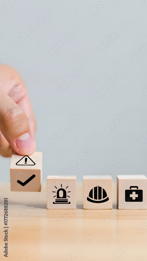 Work safety and compliance concept. Wooden cube blocks with icon of safety at workplace. Safety first, protections, health, regulations and compliance. Safety in working process. Zero accidents. #1772688281