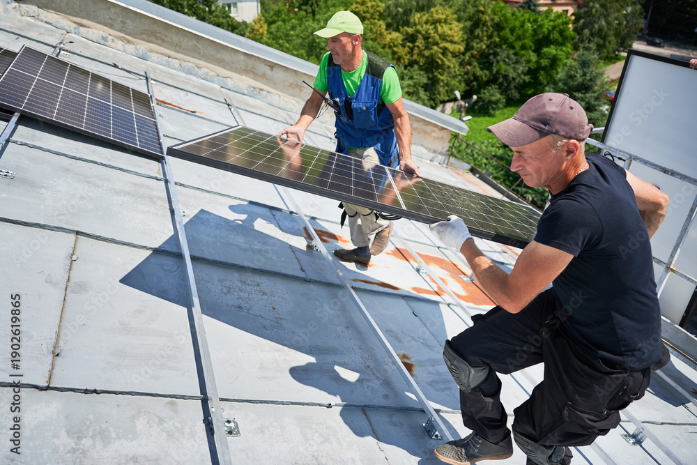 Workers building solar panel system on metal rooftop of house. Two men installers carrying photovoltaic solar module outdoors. Alternative, green and renewable energy generation concept. #1902619865
