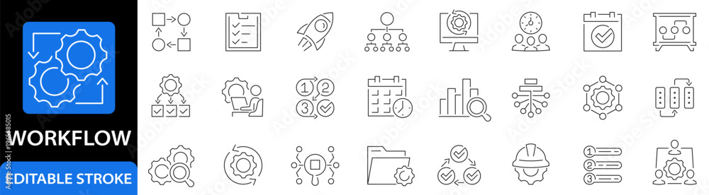 Workflow icon set. Process. Networking. Step. Management. System. Method. Planning. Editable stroke. Vector illustration #1965585015