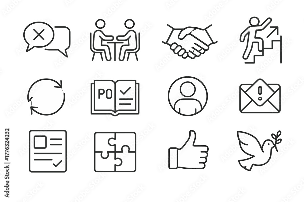 Workplace Conflict Icons. Conflict at work. Line icon set of conflict at work: crossed speech bubbles, mediation table, handshake, escalation ladder, feedback #1776324232