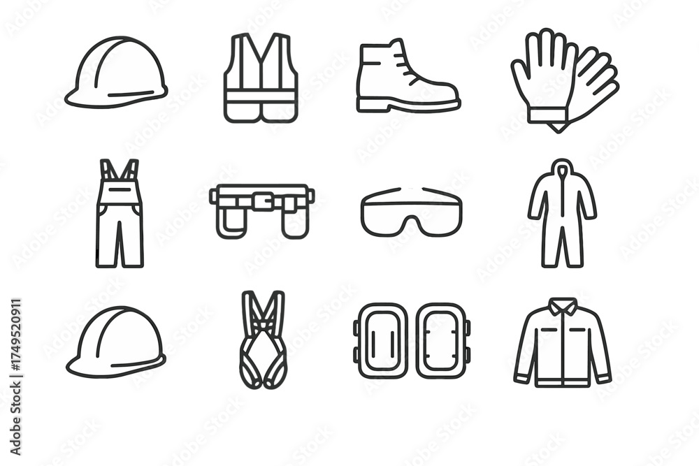 Workwear Icon Set. Workwear trends. Line outline icon set of Workwear trends: safety helmet, high-visibility #1749520911