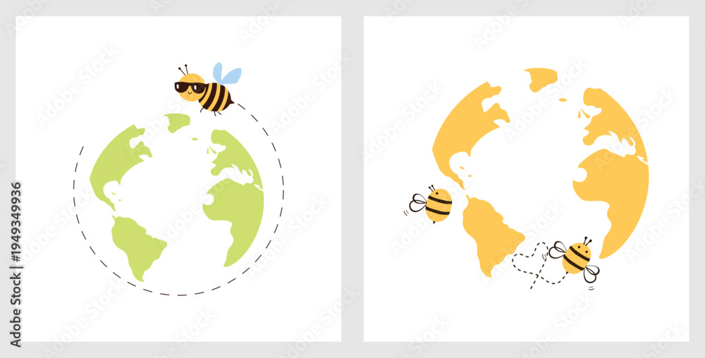 World bee day illustration with bees flying around earth globe for environmental awareness poster, banner and education design. #1949349936