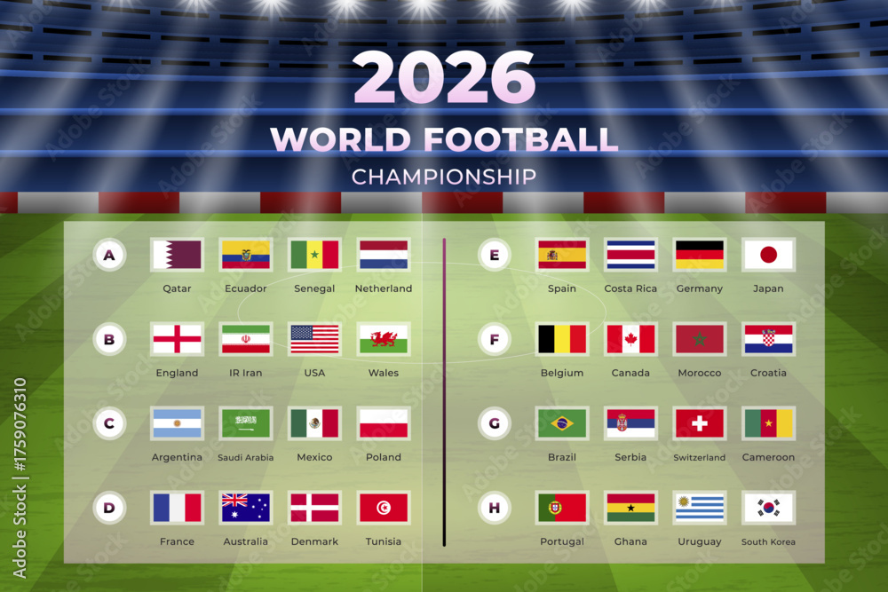 World Football Championship 2026: An illustration showcases the vibrant flags of competing nations, set against a backdrop of a stadium. #1759076310