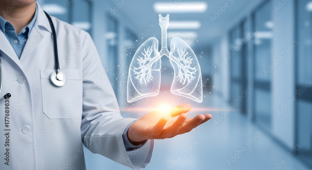 World Lung Day a futuristic glowing projection of human lungs, symbolizing advanced respiratory health care, diagnosis, and innovative treatment in a modern hospital environment #1776898381