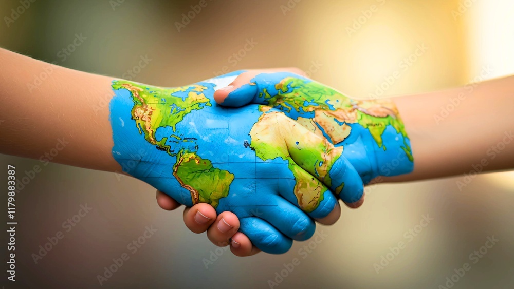 World Map Painted on Hands in Harmony Human fraternity Day #1179883387