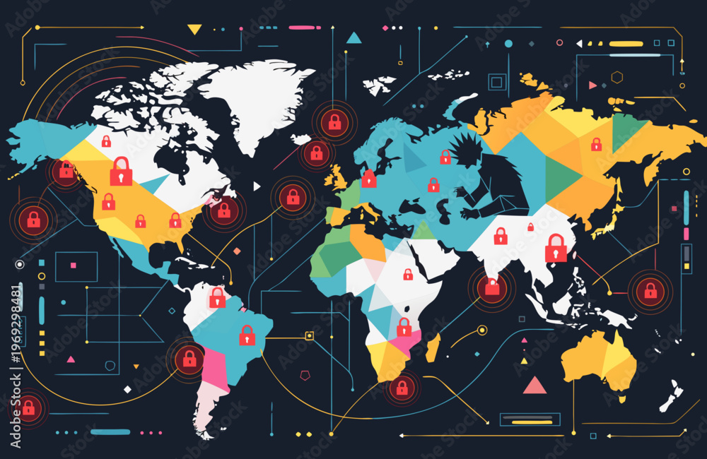 Worldwide digital security represented by a geometric world map overlaid with red padlock symbols, signifying the critical importance of data protection and network integrity globally. #1969298481