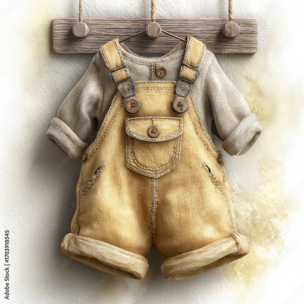 Yellow baby overalls with shirt hanging on rustic hook #1703918545
