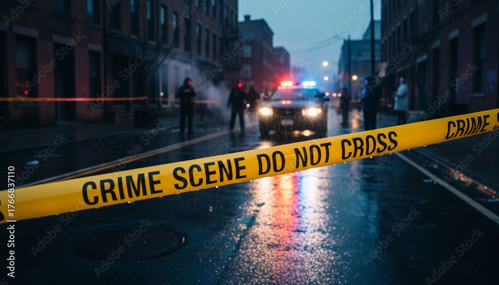 Yellow caution tape with crime scene do not cross text blocking a wet city street at night, with a police car and officers visible in the background investigating #1766837110