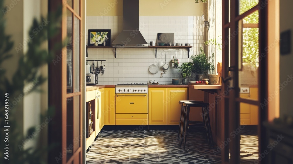 Yellow kitchen seen through a doorway, with white tile walls, geometric dark wood floor, and warm ambient lighting. #1468219576
