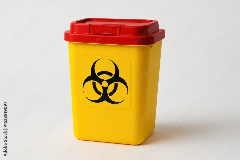 Yellow medical sharps disposal container with biohazard symbol isolated #1523919097