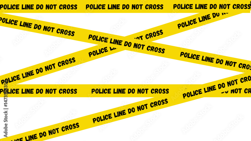 Yellow police tape with “POLICE LINE DO NOT CROSS” text crisscrossing a white background, crime scene concept#1473574353