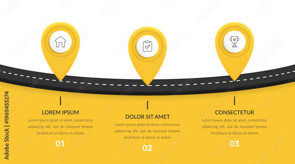 Yellow road journey infographic with three location pin milestones and text sections #1960455274
