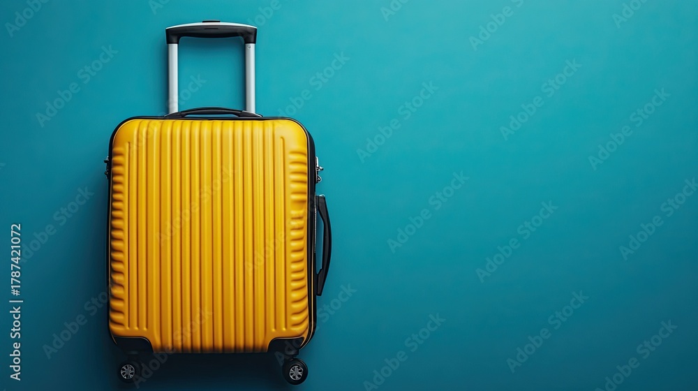 Yellow suitcase on vibrant blue backdrop, perfect for travel, vacation, and adventure, evoking wanderlust and freedom for marketing campaigns #1787421072