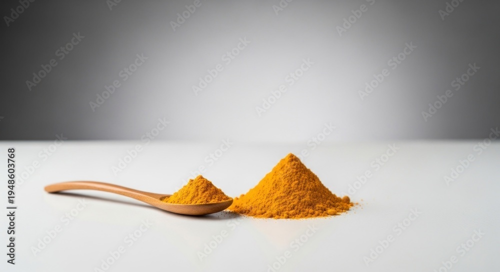 Yellow turmeric powder, spoon, and pile on a white surface with a grey gradient background #1948603768