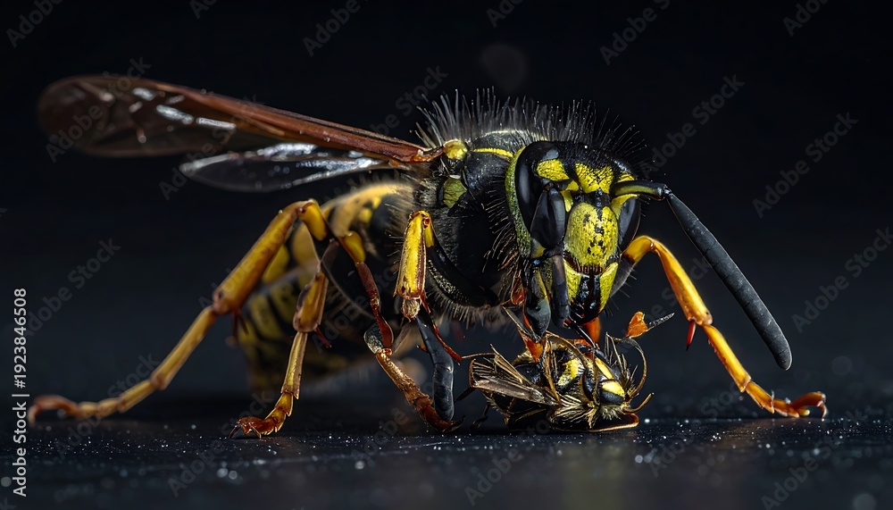 Yellowjacket wasp preying on another insect, against a dark, contrasting background, showing intricate detail #1923846508
