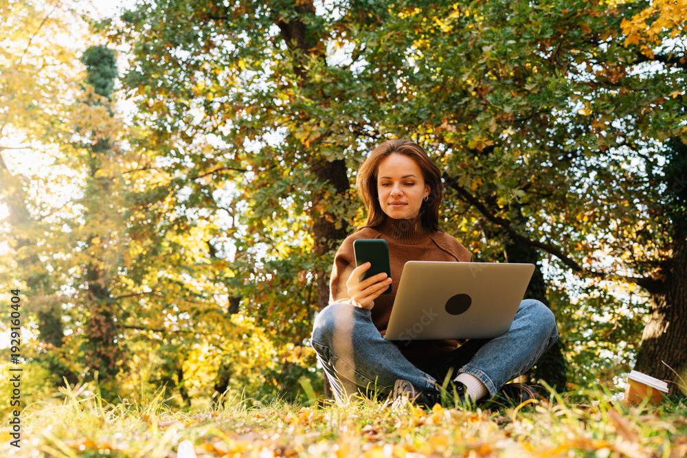 Young adult woman working outdoors in autumn park using laptop and smartphone while sitting on ground. #1929160404