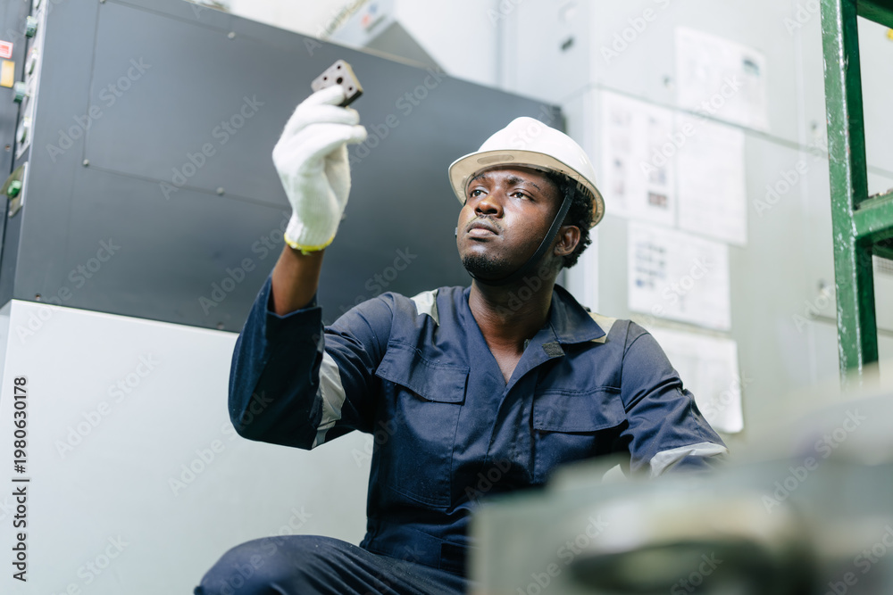 Young African black male worker in safety dress hardhat look at workpiece focused and determined. #1980630178