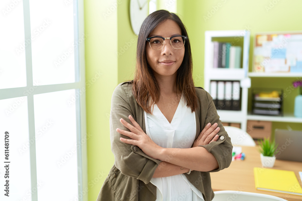 Young asian woman business worker smiling confident standing with arms crossed gesture at office #611481709