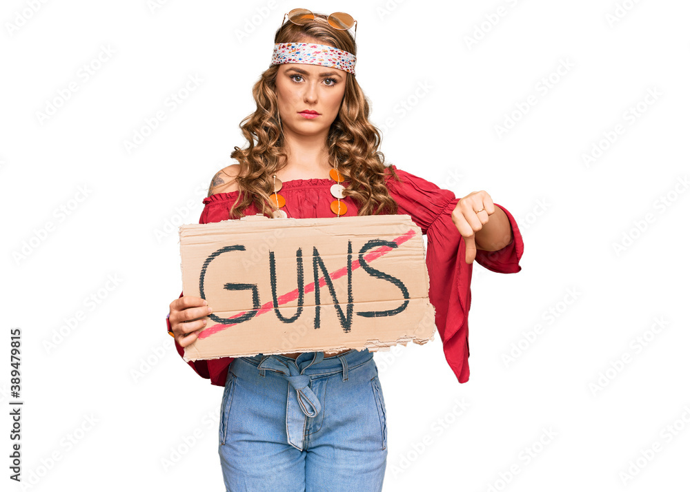 Young blonde girl wearing hippie style holding no guns warning banner with angry face, negative sign showing dislike with thumbs down, rejection concept #389479815