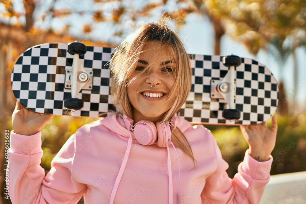 Young blonde skater girl smiling happy holding skate at the city. #499608683