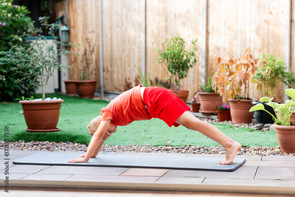 Young Boy Doing Yoga Exercises on Mat in Backyard Garden #1721987538
