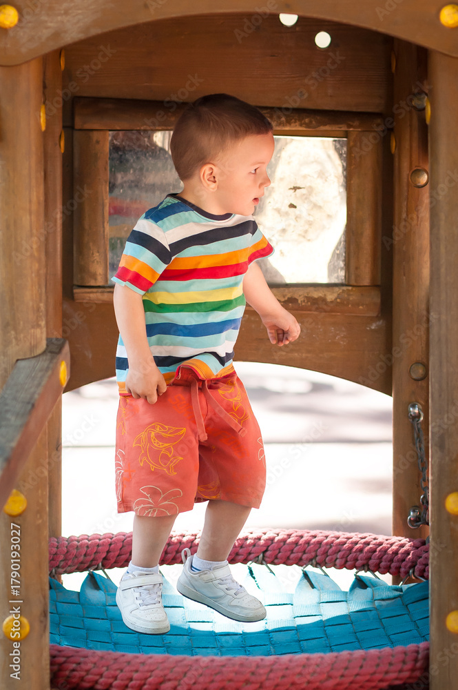 Young boy with short hair wearing a colorful striped shirt and orange shorts plays on the blue and red netted floor of a wooden play structure outdoors during the daytime. #1790193027