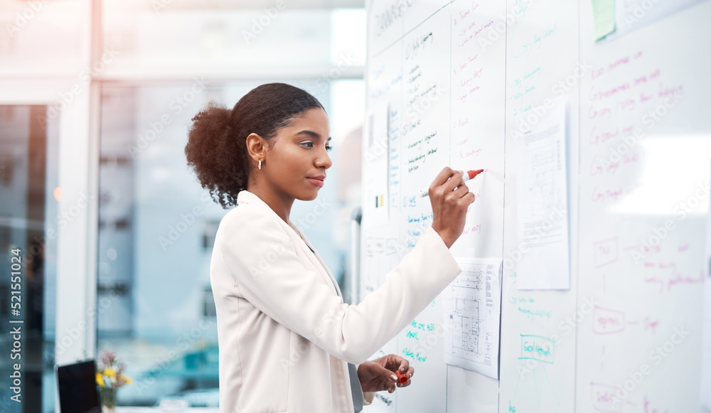 Young businesswoman planning on a whiteboard in modern office and writing a strategy for the company. Confident female African professional worker brainstorming, preparing for a presentation #521551024