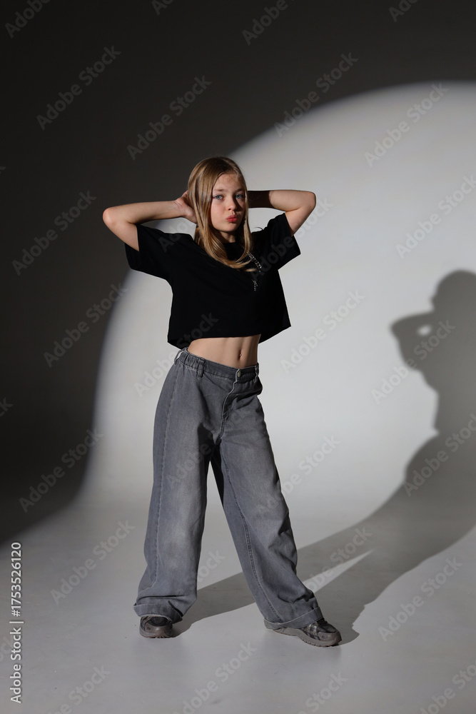 Young caucasian female posing in studio with shadows and contrast lighting #1753526120