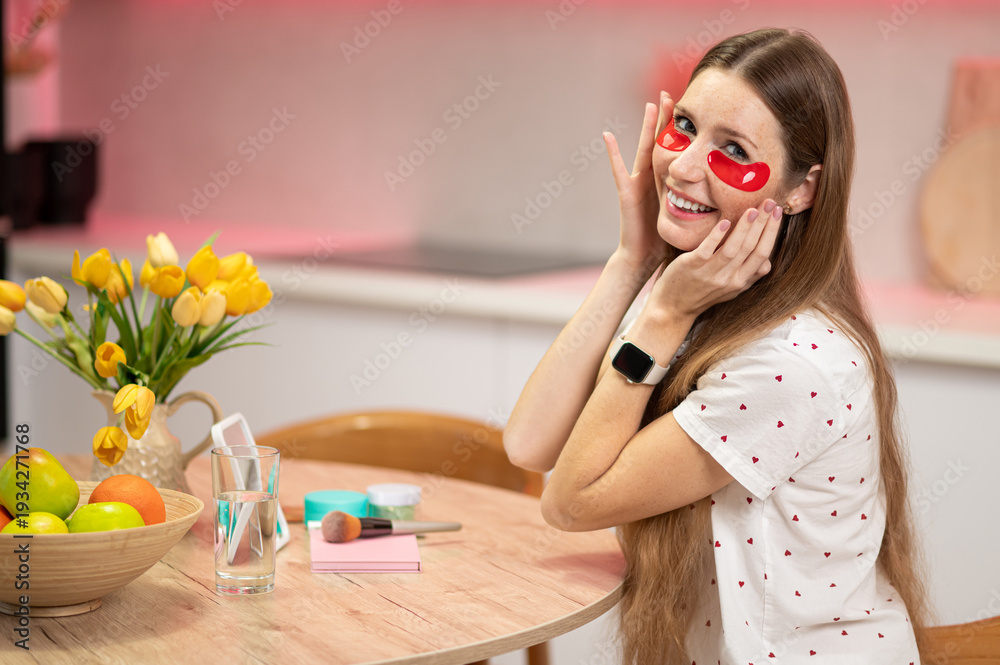 Young caucasian woman sitting ate the table and using eye and lip patches #1934271768