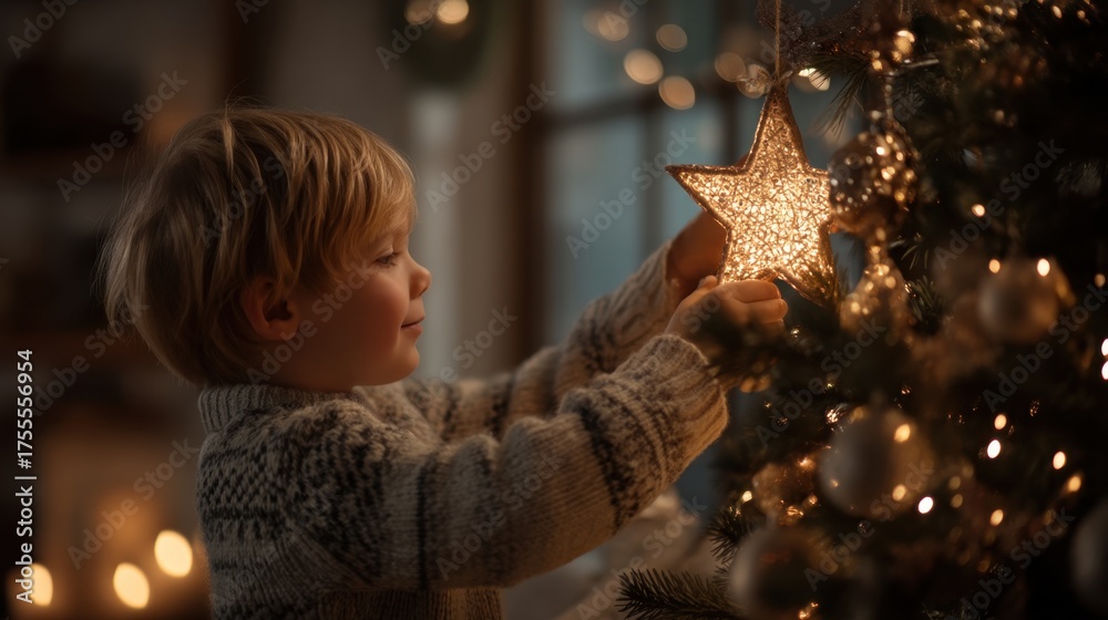 Young Child Adorning Christmas Tree with Sparkling Ornament in Cozy Holiday Setting with Warm Lights and Festive Decorations #1755556954