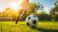 Young child s foot kicking a soccer ball on a lush green grassy field under a bright sunny sky in an outdoor recreational setting showcasing an active sports lifestyle and athletic activity #1180719072