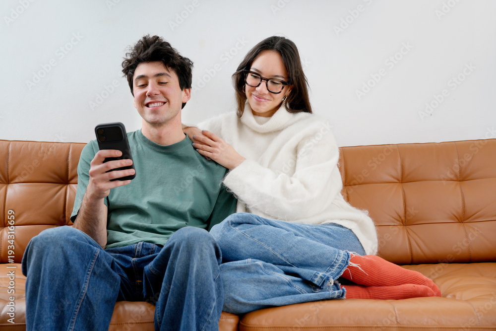 Young couple enjoying sharing smartphone content at home #1934316659