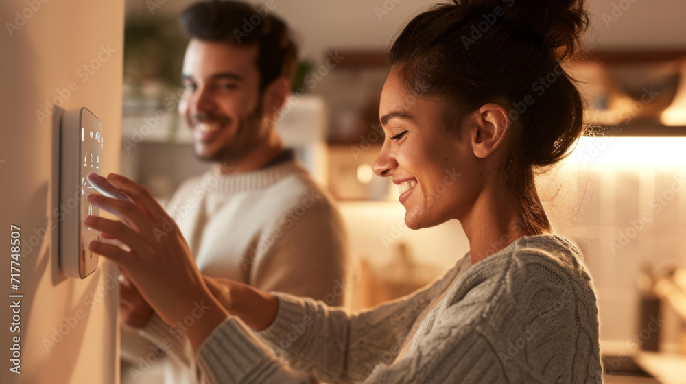 young couple interacting with a smart home control panel mounted on a wall #717748507