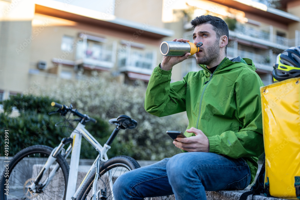 Young delivery man having rest, fast express delivery service worker drinking water from his flask, sustainability and ecologic work in trasportation industry, metal plastic free canteen #491923991