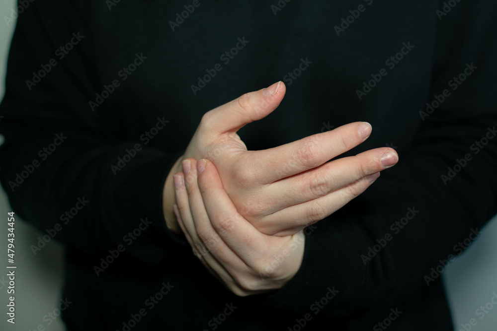 Young female​ suffering from hand and finger joint pain​. Carpal tunnel syndrome. Health care and medical concept #479434454
