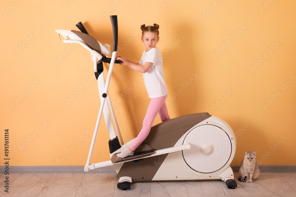 Young girl exercising on a home elliptical trainer in a modern room with a yellow wall, accompanied by a cat. Healthy lifestyle and fitness concept. #1917611114