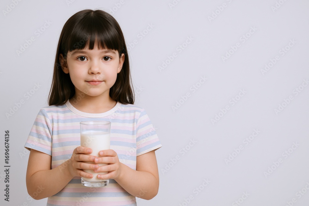 Young Girl Holding a Glass of Milk, Promoting Healthy Habits and Dairy Consumption on White #1696674136