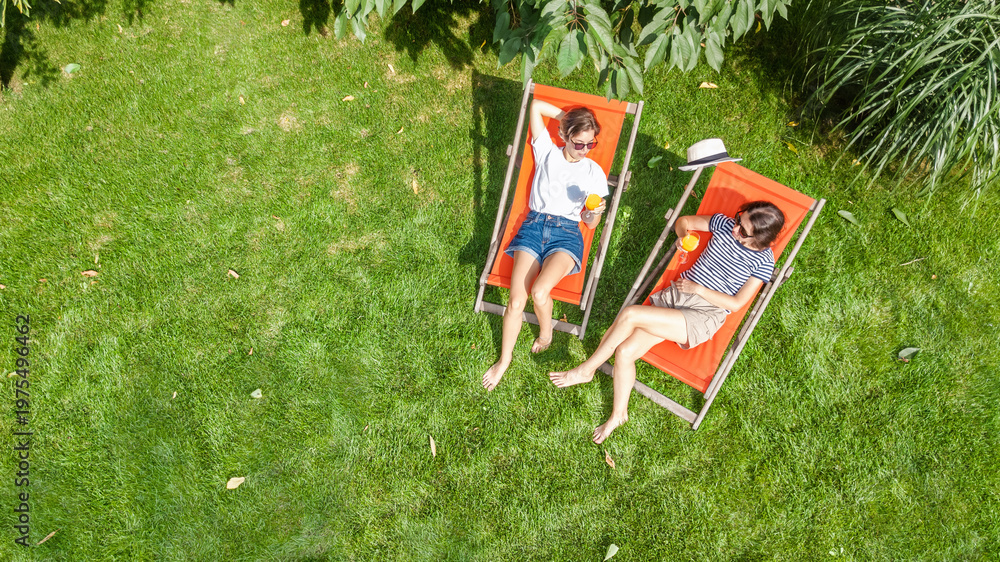 Young girls relax in summer garden in sunbed deckchairs on grass, women friends having drinks outdoors in green park lawn on weekend, aerial drone view #1975496462