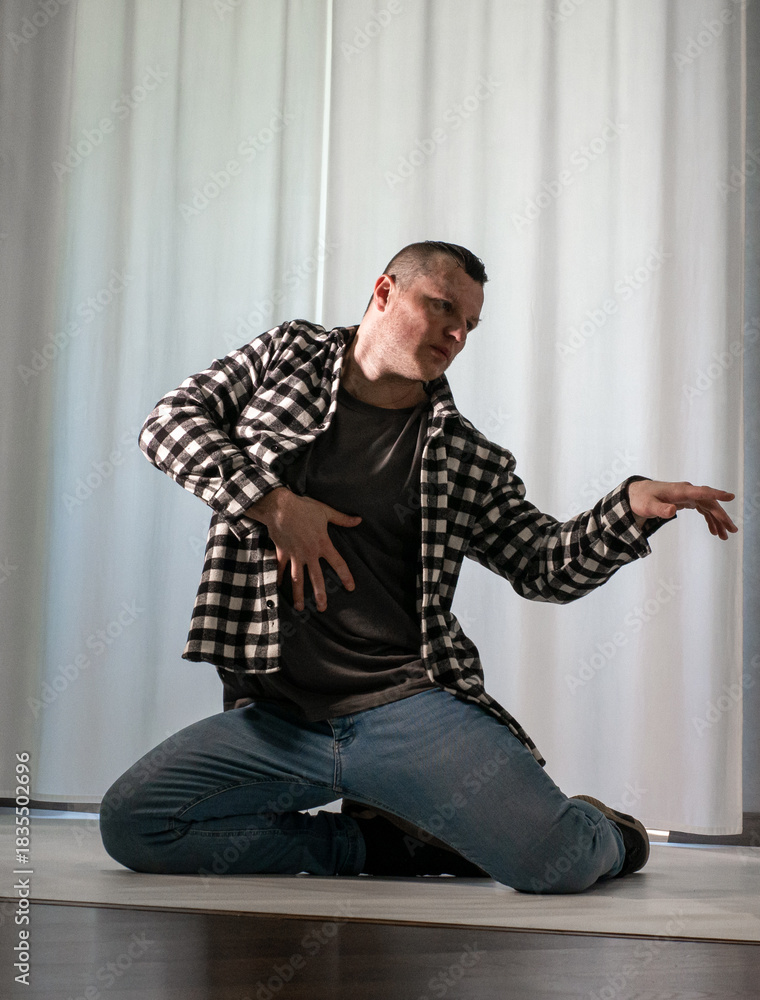 Young guy in a dancing pose on a white background. Modern dance in a plaid shirt. Sports plastic movements of arms and legs and body. #1835502696