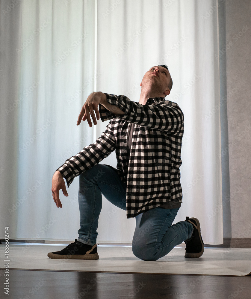 Young guy in a dancing pose on a white background. Modern dance in a plaid shirt. Sports plastic movements of arms and legs and body. #1835502714