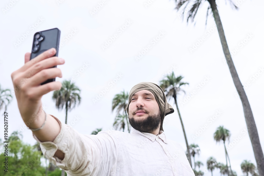 Young hispanic traveler taking a selfie with his phone in El Palmar National Park, in Entre Rios, Argentina. #1936207757