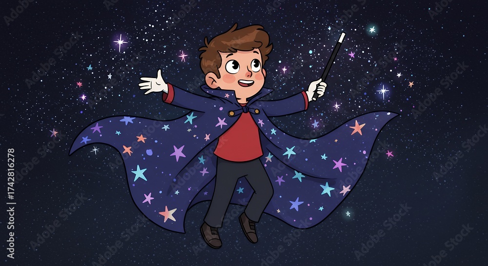 Young magician performing magic with wand and stars illustration isolated on dark background #1742816278