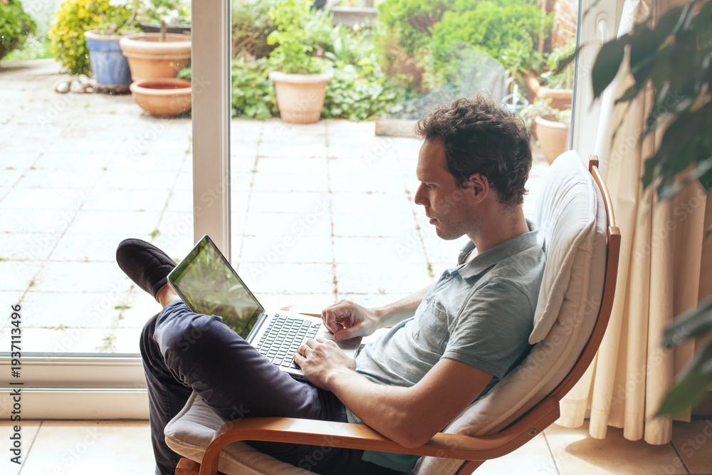 Young man browsing the internet on a laptop while sitting in an armchair at home #1937113496