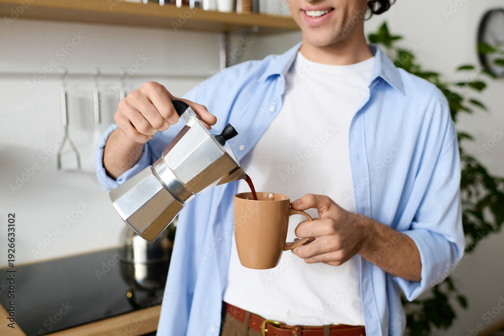 Young man enjoys making coffee at home in a cozy apartment setting #1926633102
