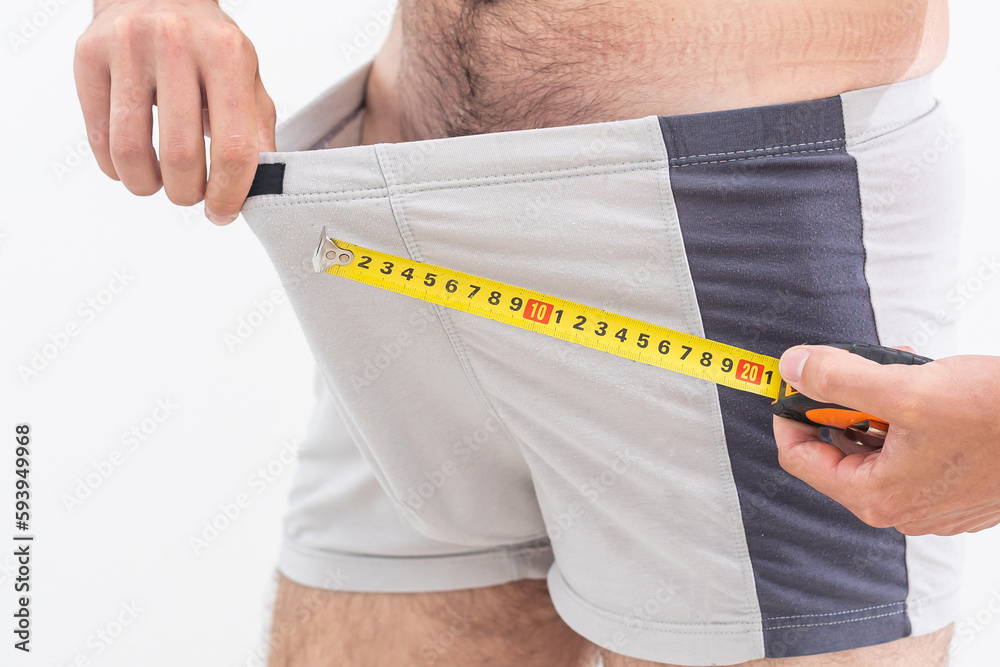 Young man holding tape measure, measuring his penis - focused at the middle of tape measure. #593949968