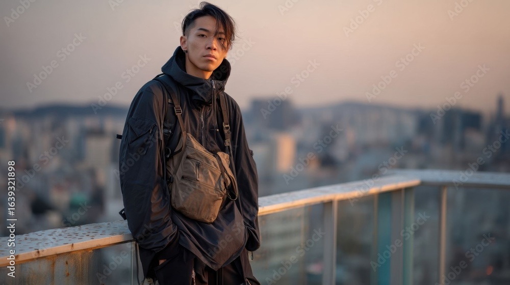 Young man in techwear on rooftop. #1639321898