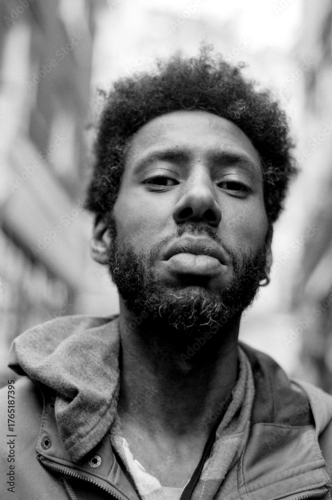 Young man posing in urban setting, grainy black and white portrait #1765187395