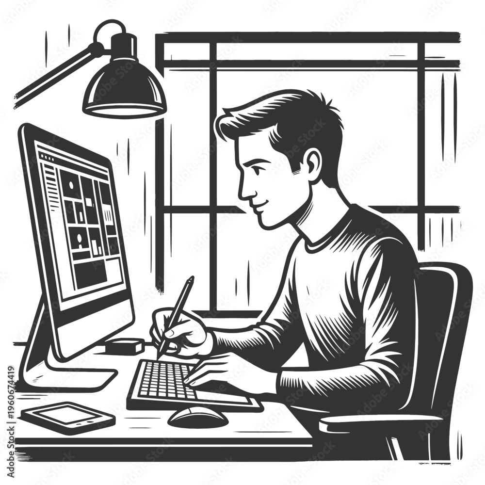 young man using a computer and drawing tablet at desk, digital design, creativity, and remote work sketch engraving generative ai vector illustration. Scratch board imitation. Black and white image. #1960674419
