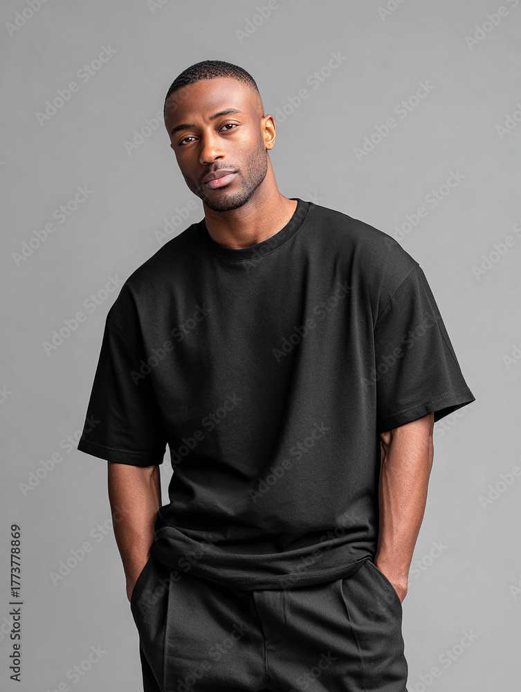 Young man wearing a simple, oversized cotton black T-shirt and trousers in a studio. Modern, minimalist style. Clothing template. #1773778869