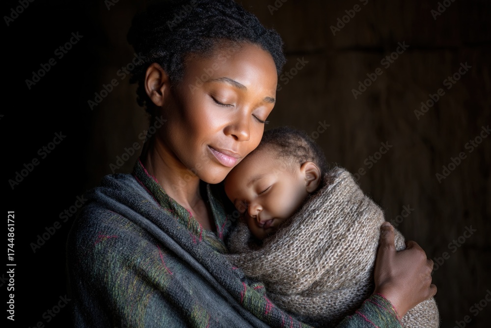 Young mother holding her sleeping baby close in a loving embrace #1744861721